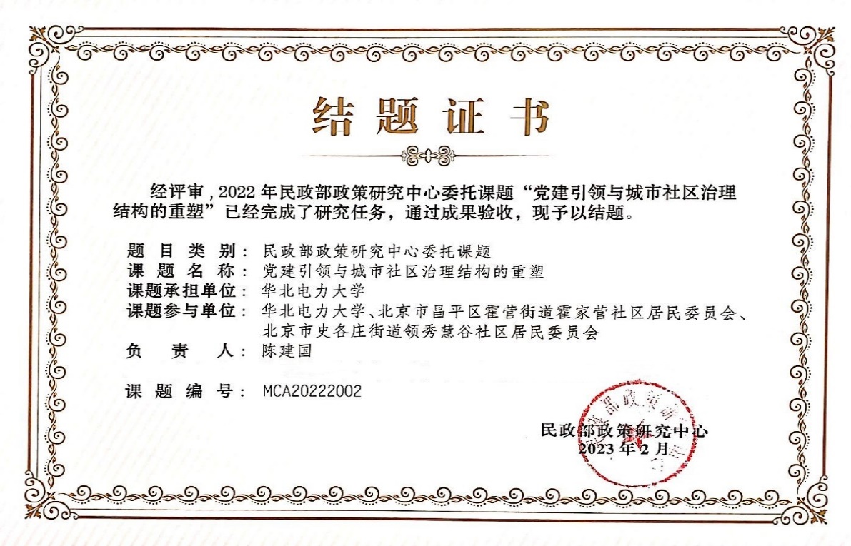 自成立以来,回天治理研究院持续深耕回天沃土,开展了一系列富有成效的研究项目,最近研究院联合回天地区社区开展的合作研究又获得了新进展。2022年以来,回天治理研究院教师联合北京市昌平区霍营街道霍家营社区居民委员会、北京市史各庄街道领秀慧谷社区居民委员会承担了民政部委托的课题“党建引领与城市社区治理结构的重塑” 。经过双方的合作努力,课题组已经完成了研究任务,于2023年2月通过成果验收,顺利结题。
