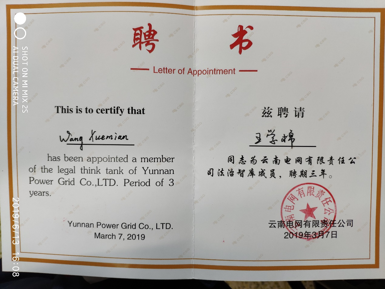 近日,云南电网有限责任公司给王学棉教授发来聘书,聘请其为公司法治智库成员,聘期三年。王学棉教授作为华北电力大学电力立法研究中心主任,近年来投入大量精力从事与电力行业相关的法律研究,推出了大量成果。这次聘任又一次表明电力立法中心越来越被行业认可,影响力也越来越大。面对信任,电力立法研究中心一定会充分发挥优势,不辜负云南电网等行业公司的期望,为行业法治作出自己的贡献。
