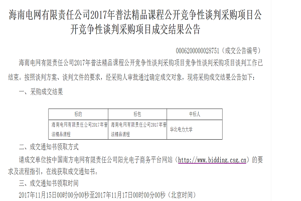 2017年11月15日,海南电网有限责任公司就2017年普法精品课程项目公开竞争性谈判采购项目在南方电网阳光电子商务平台上发布公告,华北电力大学中标。