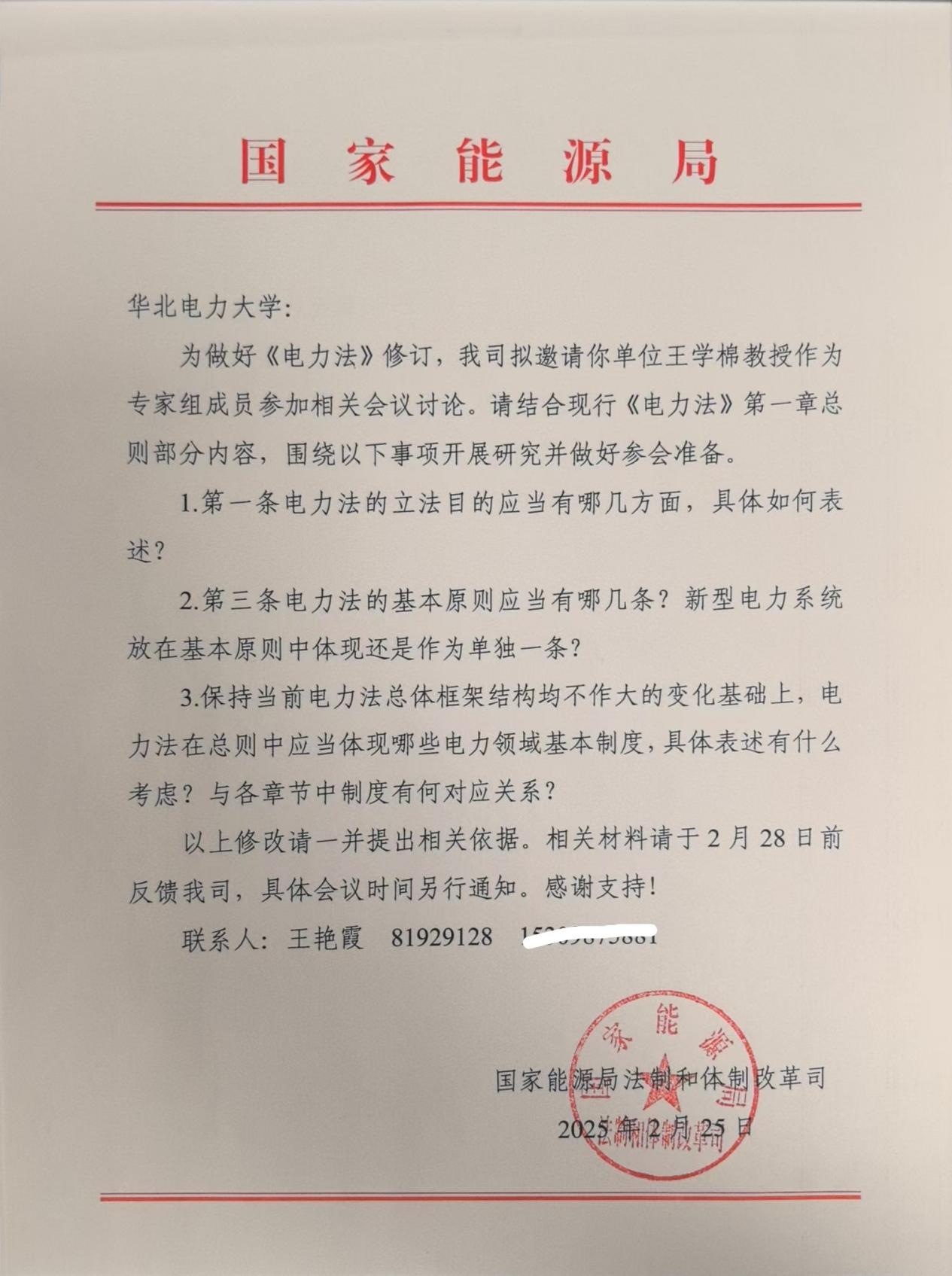 近日,国家能源局向公司发来函件,聘请王学棉教授作为专家组成员参加《电力法》的修订工作。这是继yl23455永利集团周凤翱教授参与《能源法》制定后,公司法学专家又一次参加重要的能源法律修订,表明公司法学专业在能源特色法学领域具有强劲的研究实力。