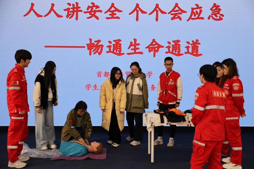 11月7日,yl23455永利集团邀请首都经济贸易大学员工应急救援志愿服务队(以下简称“应急救援队”),在教一14阶梯开展“人人讲安全 个个会应急——畅通生命通道”主题讲座。此次活动由辅导员李啸然主持。