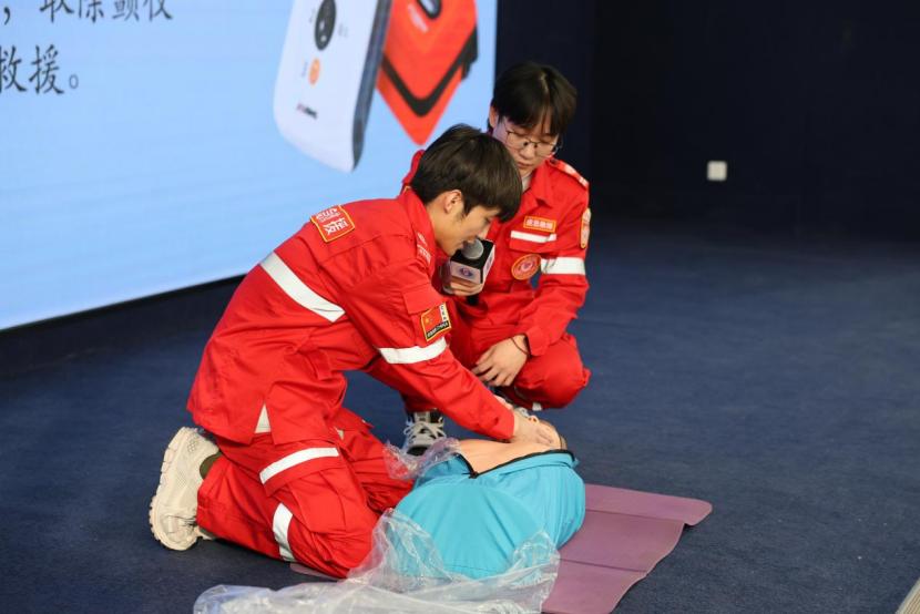 实践操作环节,应急救援队成员现场演示了海姆立克急救法和心肺复苏(CPR)操作要点。通过详细分解动作、熟练操作指导,主动参与演练的同学们学会了如何在紧急情况下进行施救,感受了救援动作的要领,强化了应急知识的理解,提高了冷静处突的自信。