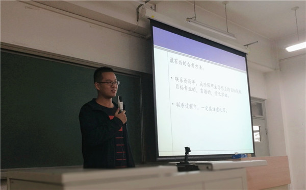 第二个出场的是于家琪学姐,目前就读于华北电力大学国际经济法专业,开朗的她回忆自己的本科生活,直言不讳地说自己是个非常爱玩的姑娘。于家琪学姐别出心裁地把自己和自己的初高中同学的人生轨迹作了一个对比,从而告诉同学们并非考研才是唯一的道路,不要盲目随大流,也不要为了混个文凭而读书,弄清楚自己真正想要的,才是成功的人生。此外,她还和同学们分享了自己研究生生活给自己和周边的人带来的生理上和心理上的双重变化,在她看来,研究生生活是压力与乐趣并存的,要学会把时间用在刀刃上,也要学会通过培养良好的生活习惯和丰富的兴趣爱好,调剂忙碌的生活。