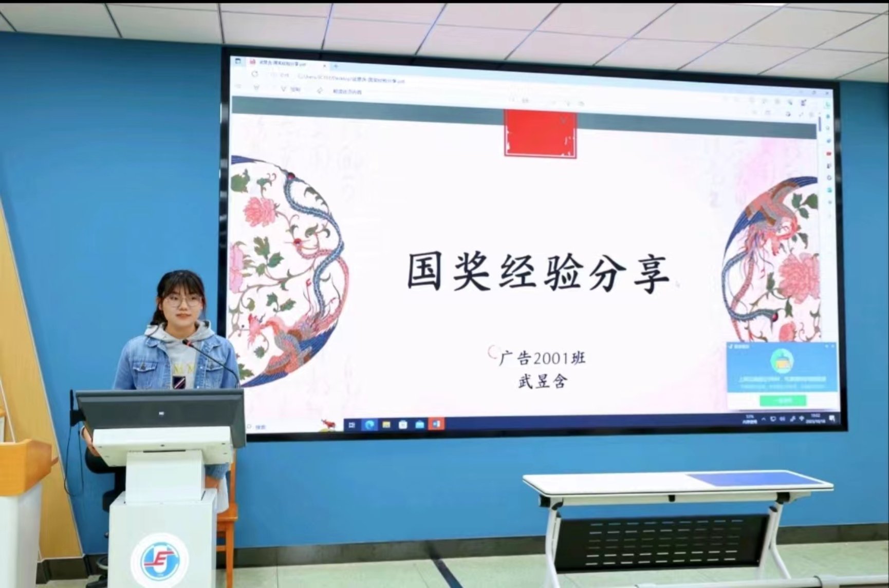第一位国奖经验分享者是广告2001班的武昱含同学。武昱含同学从学习和工作两方面展开分享。首先,武昱含同学为同学们介绍了国奖及评选标准,强调了学习成绩排名与综合成绩排名的重要性,倡导同学们努力学习专业知识,充实自己。会上武昱含同学还分享了她参与庆祝中国共产党成立一百周年、北京2022冬奥会、同盟会等大型活动的经历,她建议同学们积极志愿活动,锻炼自己,提升能力。其次,武昱含同学就员工工作方面提出恳切建议,不能因工作繁忙而放弃学习,也不能因专注学习而不做工作,要平衡好学习与工作的关系。最后,武昱含同学总结出四点获奖心得与同学们共勉,一是勤学好问、勤能补拙,二是保持初心、找寻兴趣,三是实践体验、丰富自我,四是乐观积极、保持心态。