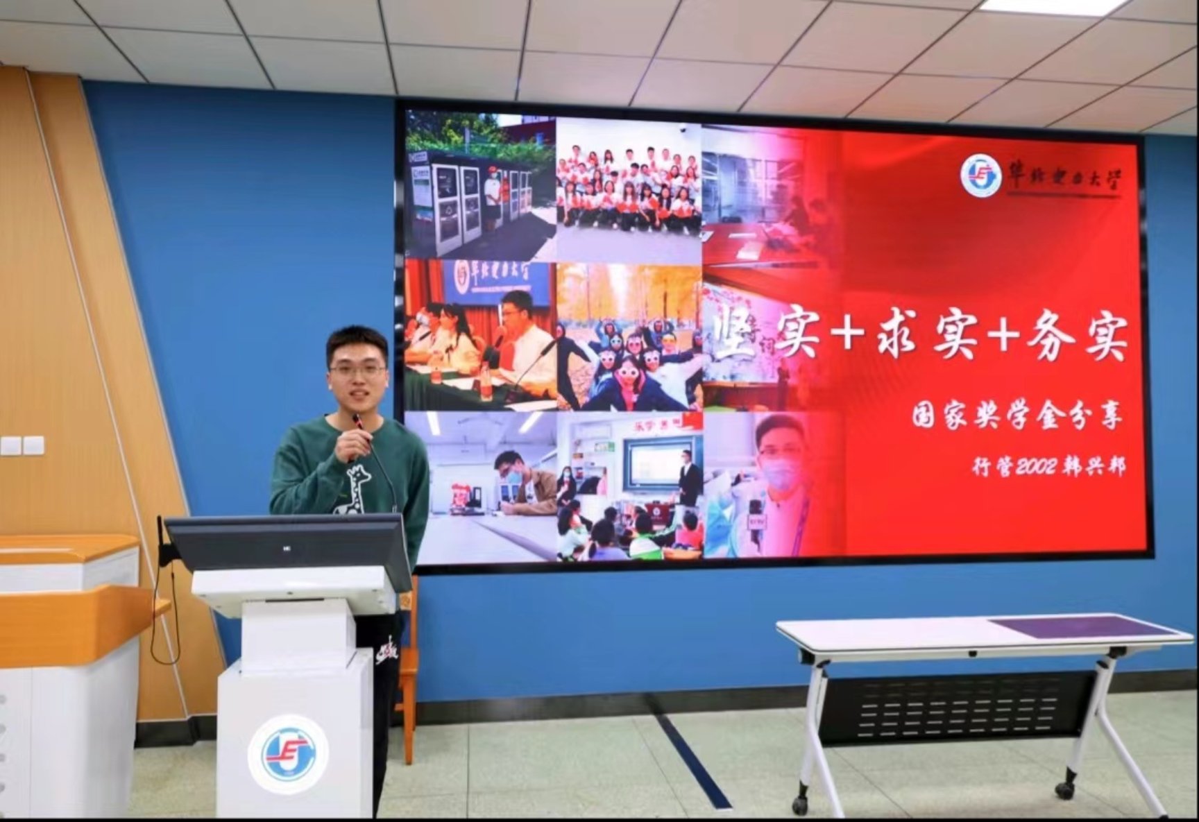 第三位国奖经验分享者是行管2002班的韩兴邦同学。韩兴邦同学从坚实、求实、务实三个方面与同学们进行了交流分享。在坚实方面,一方面他倡导同学们一心向党,积极入党,另一方面他鼓励同学们一定要脚踏实地奋斗,努力学好专业知识。在求实方面,他强调了全面发展的重要性,建议同学们积极参与各项学科竞赛。在务实方面,他从员工工作和志愿服务两方面为同学们了讲述相关的经验与收获。最后韩兴邦同学希望同学们都能不断丰盈自身、锐意进取,以青年的朝气和活力面对生活中的一切困难挑战。