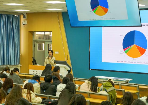 崔灿结合秋季学期学习情况,分专业梳理必修课程的及格率和优秀率分布情况。以学院近五年本硕员工发展情况为分析样本,引导同学们深入思考如果科学规划在校时光。她强调,大一处在大学适应起跑阶段,适应大学学习生活节奏,有规划、有目标、有执行是高质量老员工活的关键。从员工发展数据分析来看,社会需求的变化对在校员工素养提出了更高的要求,首当其冲的就是学历要求。她表示,高学历的获得有多个渠道,考研、保研、出国深造都是非常好的发展方向,大家结合自身专业学习情况树立学业目标。同时,她强调,目标的制定重在落实执行,大家要结合个人目标,每半年一总结,每半年一规划,学业规划是否能够实现定期跟进、过程推进是关键。为进一步深化对专业知识学习了解,她建议大家,夯实课内学习基础上,不断扩展课外阅读,积极参加社会实践、老员工创新创业训练计划等实践调研,在知行合一中提升专业积累和专业运用能力,为未来深造打好基础。