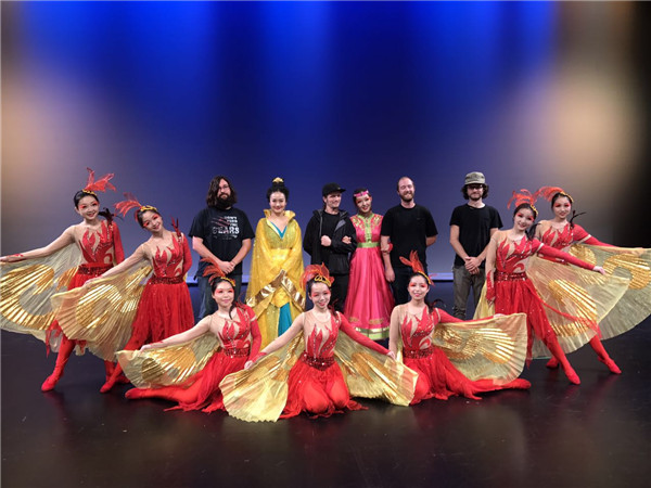 5月2日上午11时15分,第一场演出顺利完成。虽然整场演出只有45分钟,但无论是公司潘悦同学参与编舞的古典舞《美人楼》、李蕾同学参与编舞的汉唐舞《凤舞鸾飞》和民族舞,还是悠扬的乐曲,潇洒震撼的武术,都让外国的小观众们报以十分热烈的掌声和欢呼声,他们也都被我们的中国文化深深吸引着。在最后的谢幕环节,演员向观众们赠送了具有中国特色的小礼品,并合影留念,现场气氛十分热烈。