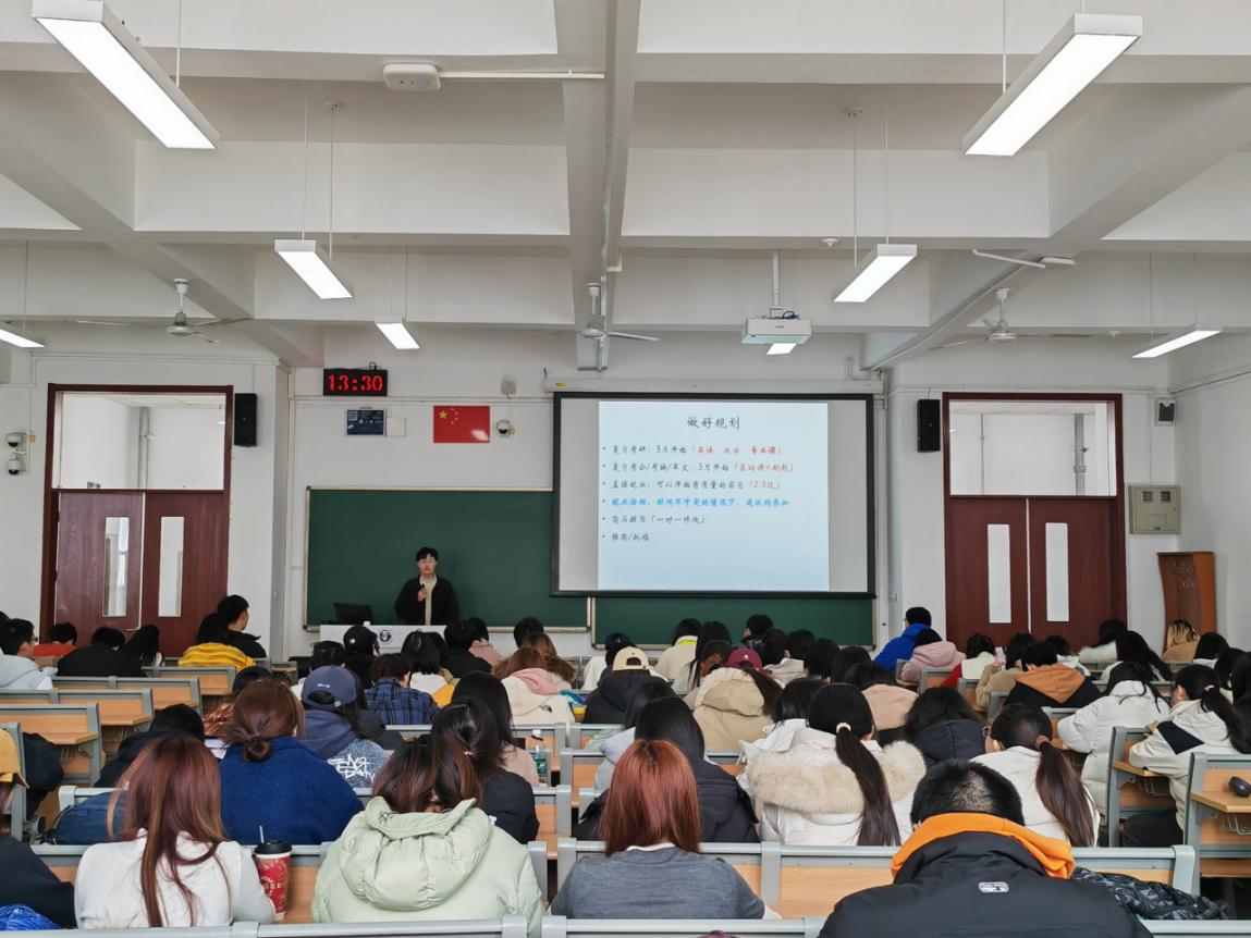 李啸然通过今年考研国家线与近三年学院硕士研究生录取情况进行实例解读,以真实数据剖析了考研择校的重要性,并给出英语、政治等科目的复习进度与规划建议。同时,他强调,同学们要提早制定考公考编的学习方案,学习内容精确到每天、每周,建议行测与申论科目的学习同时开展,夯实知识点、巩固基础题,做到不遗不漏,注重阶段性温故知新。