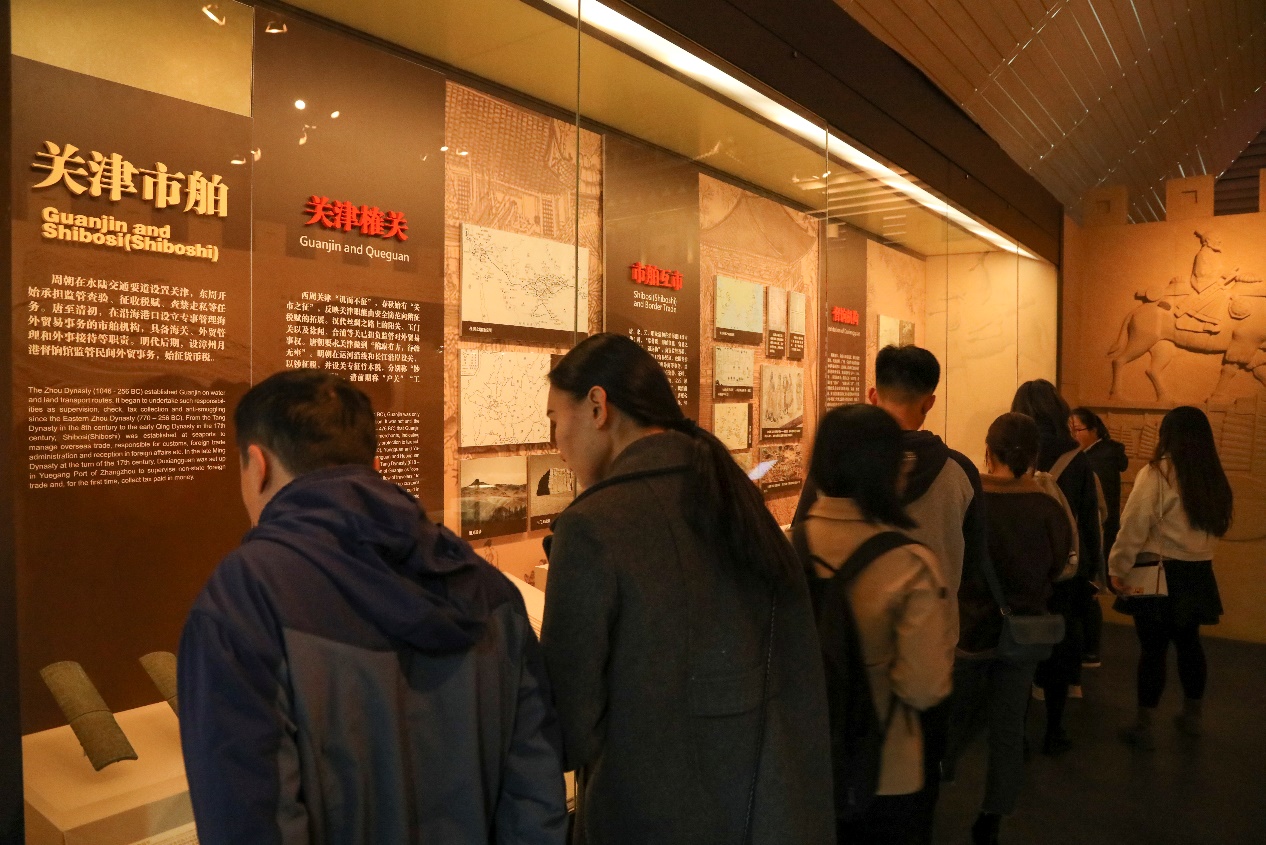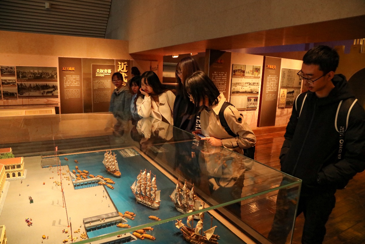 同学们抵达的下一个展厅是“千秋海关”。纵观历史沿革,关是国之门面,是国之尊严,交易往来铸就了关的千古辉煌。纵横千年,市集变迁,船舶往来。展厅内展示的各项藏品无不见证着中国关口商业贸易的发展历史。