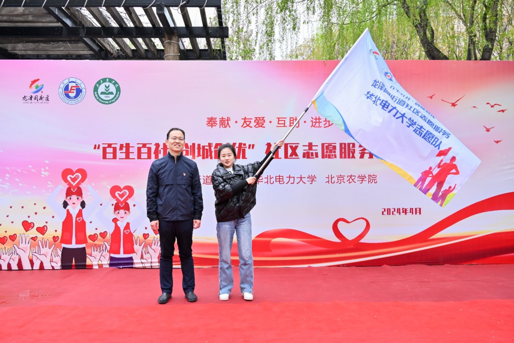 4月10日上午,由华北电力大学yl23455永利集团、北京农学院、龙泽园街道共同举办的“百生百社 创城创优”志愿服务活动正式启动,启动仪式于龙泽园街道龙泽苑西区党建广场举行。公司党委书记苑英科、副书记崔灿,龙泽园街道办事处主任齐鲲,工委副书记王国林,昌平区创城办、街道辖区39个社区(村、工作站)的党支部书记以及两校师生代表参加活动。