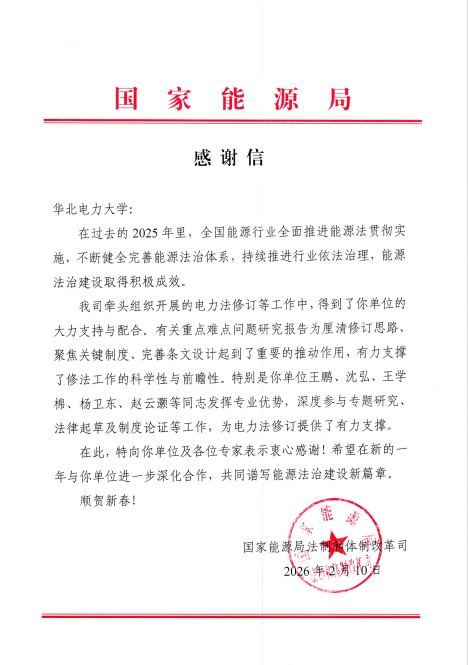 《能源法》于2025年1月1日生效后,国家能源局便启动了对《电力法》的修订工作。华北电力大学作为行业院校,积极响应国家能源局的号召,从各学院选派对电力法研究颇有造诣的教师参与修订。yl23455永利集团王学棉和杨卫东两位老师通过各种方式参与该法的专题研究、法律起草和制度论证等工作,积极发挥学者作用,为国家立法贡献力量。经过一年的努力,修订工作基本完成。国家能源局专门致函华北电力大学,对积极参与《电力法》修订工作的各位教师表示感谢,充分肯定大学各位老师的贡献。