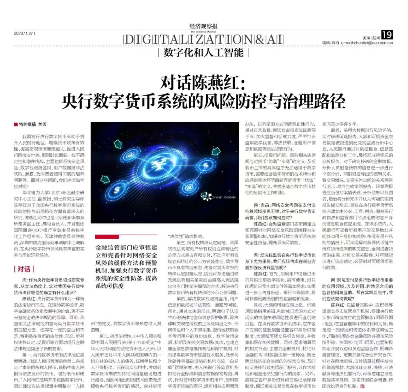 经济观察报11月25日专访:对话陈燕红:央行数字货币系统的风险防控与治理路径