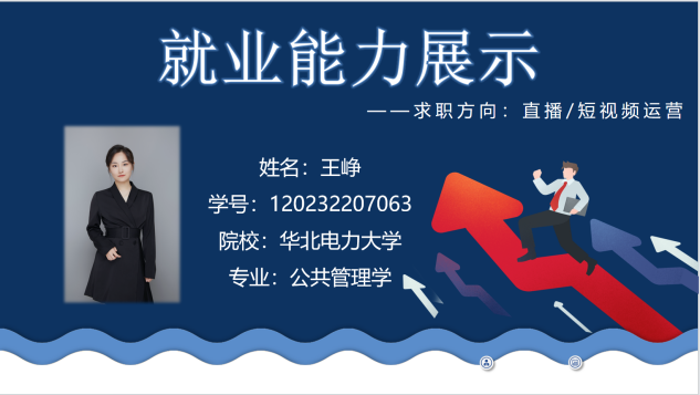 研人文2372班王峥以直播/短视频运营为主要的求职方向,在ppt里讲述了自身职业发展选择历程,分享了老员工和研究生在选择非本专业的就业市场时,如何一步一步从无经验的小白来增强自身的求职竞争力,扩展未来职业选择性。